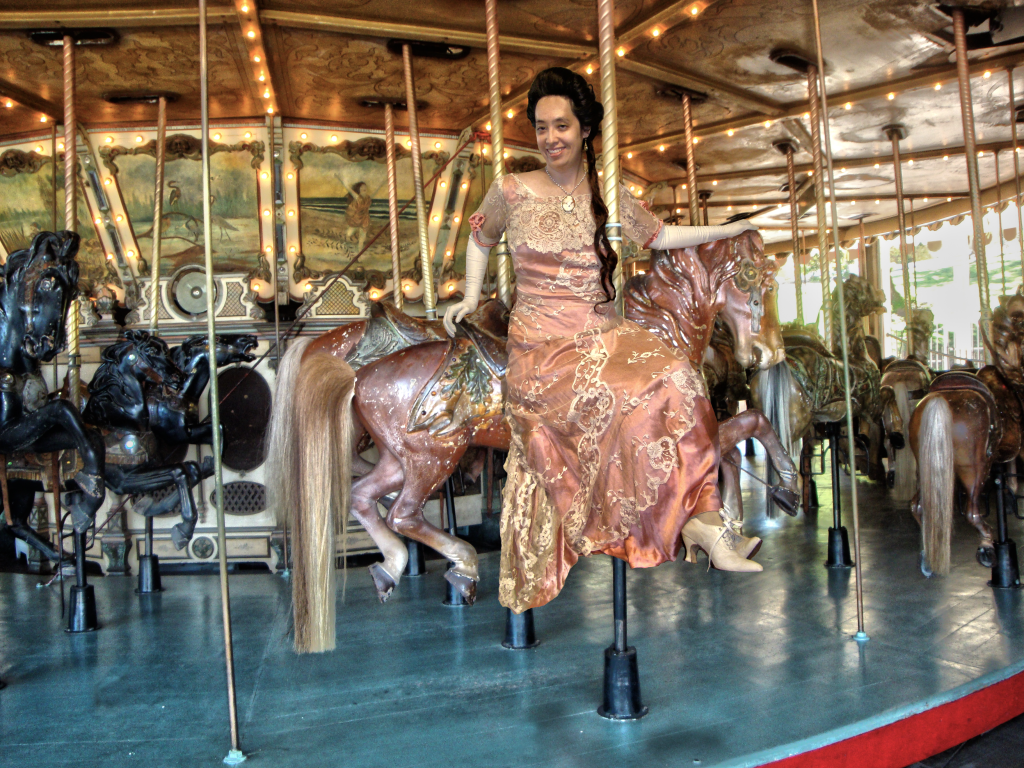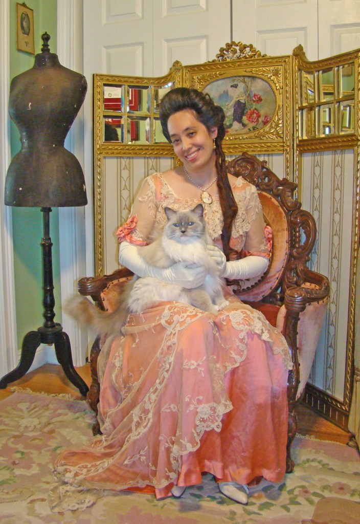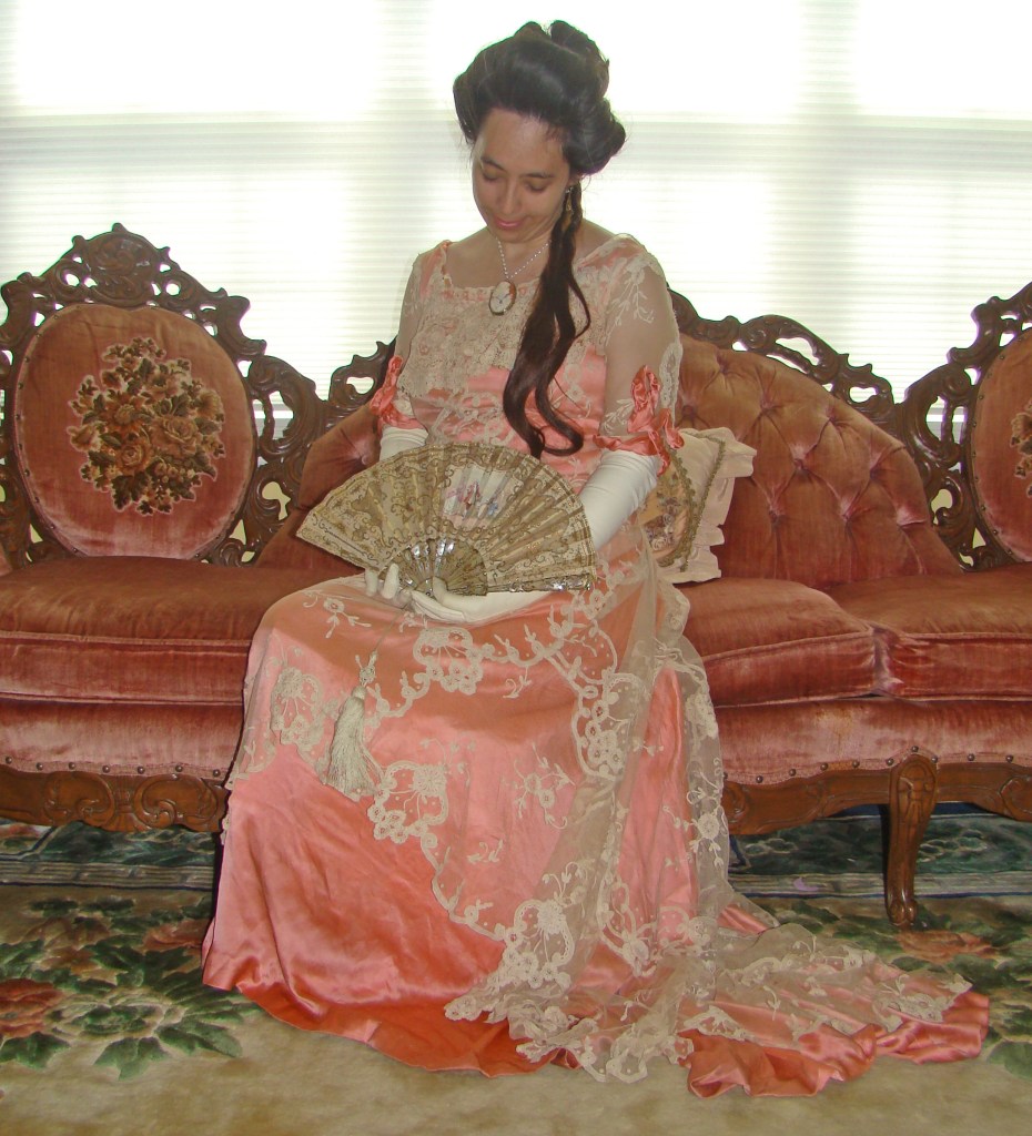 I credit my dressmaker Leslie Aitken for really fixing up this dress. It was a very tough job because apparently whoever had it made in 1908 did not have a clue as to how to properly create a dress. The hemline was super wonky when worn. We both later came to the conclusion that who ever made it, had looked at other photos of ladies of the time period and had observed how they swiveled the train to the front for their pictures, and from this deduced that the train went to the side. The fabric had literally been cut with a slant to the side not the back. It made it a very difficult piece to fix. The skirt did not even have a finished waistline and was held together by a small thin nail! Can you imagine? I am happy that after loads of countless hours from Leslie that we were finally able to fix this piece up and properly sew it together!