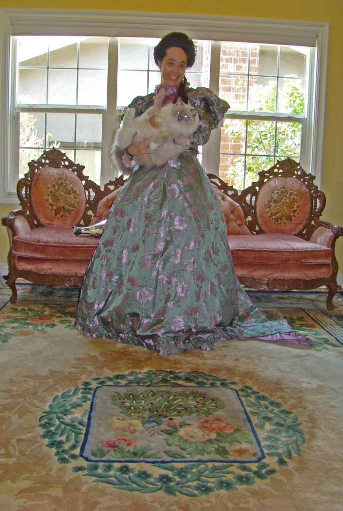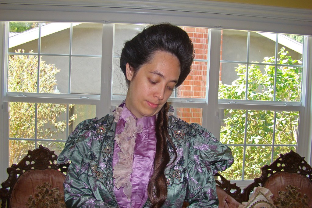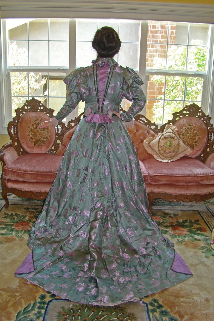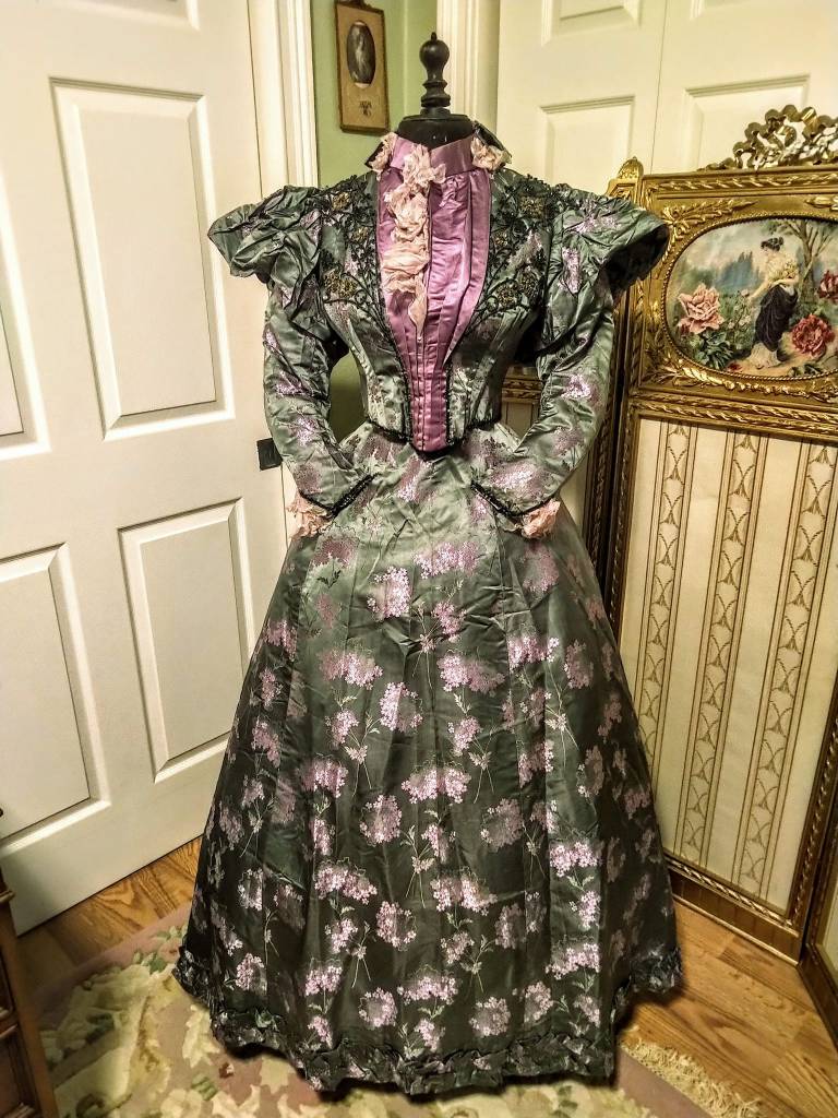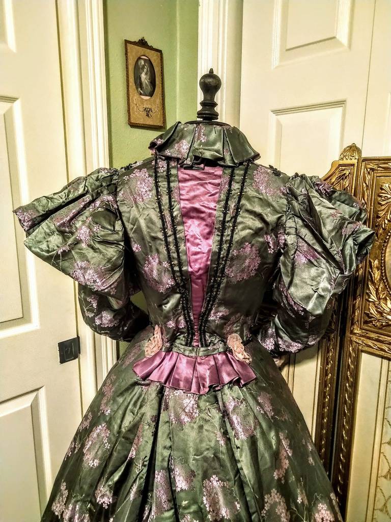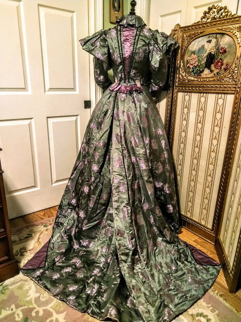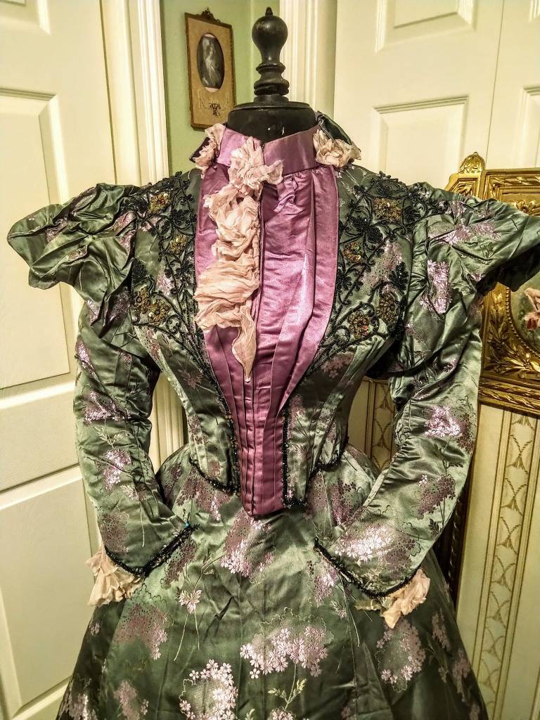 1890s antique dinner/reception gown made of embossed green silk and beading. This piece is so beautiful I still marvel at how well its preserved! They do not make them like this anymore!