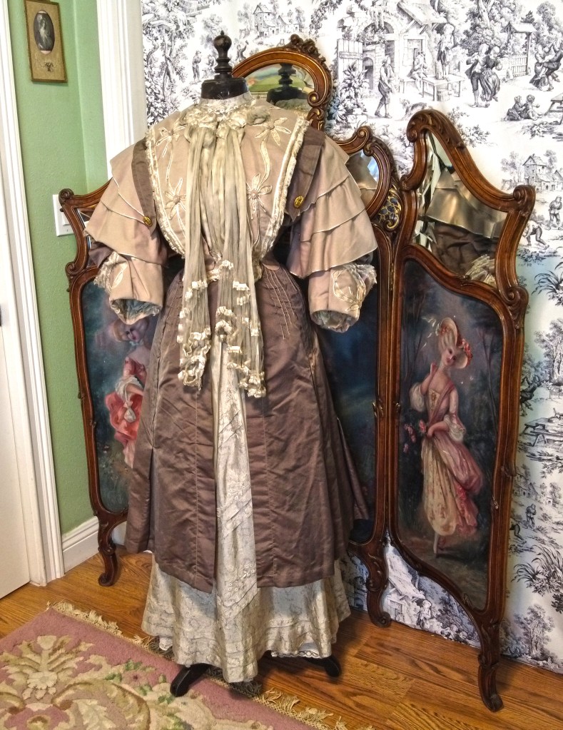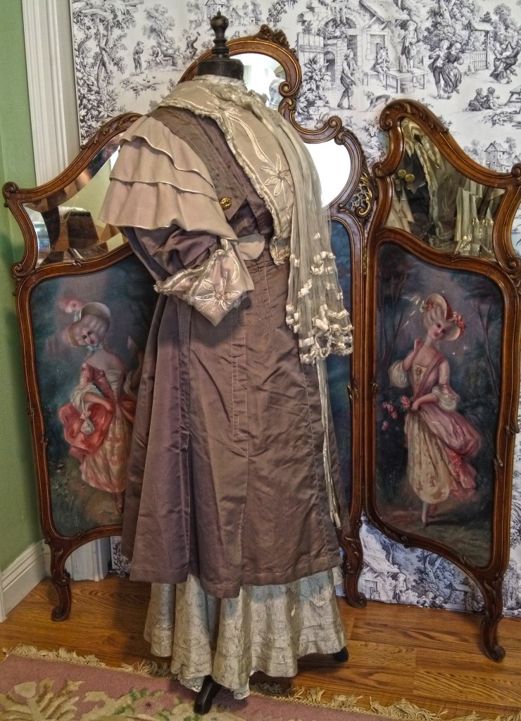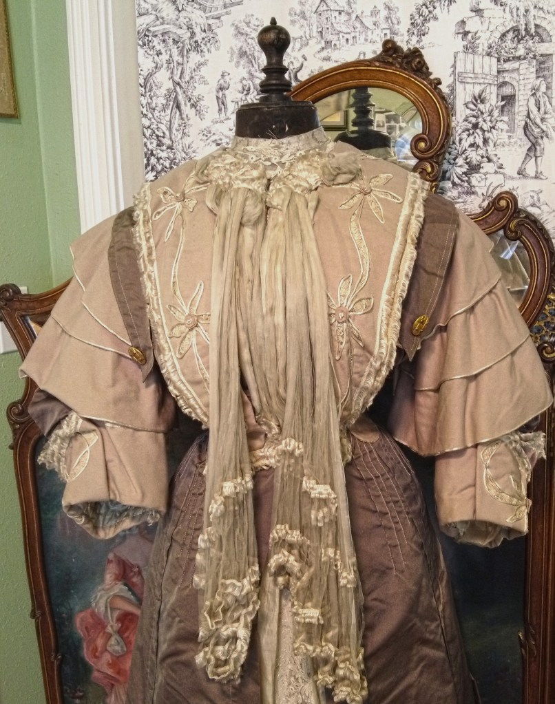 Presenting a lovely antique Victorian/Edwardian coat circa late 1890s early 1900s in ribbed silk faille with pale blush ecru hued wool. Enhanced with a double braided fringe trimmed wool pelerine style collar neckline featuring silk soutache trimmed floral cutouts with lace inserts and layered 3D wool flower centers. The center neckline has gathered sheer tissue silk chiffon puffs with short tiers of the braided fringe from which extend two long pleated tissue silk chiffon scarf extensions also trimmed in the braided fringe
