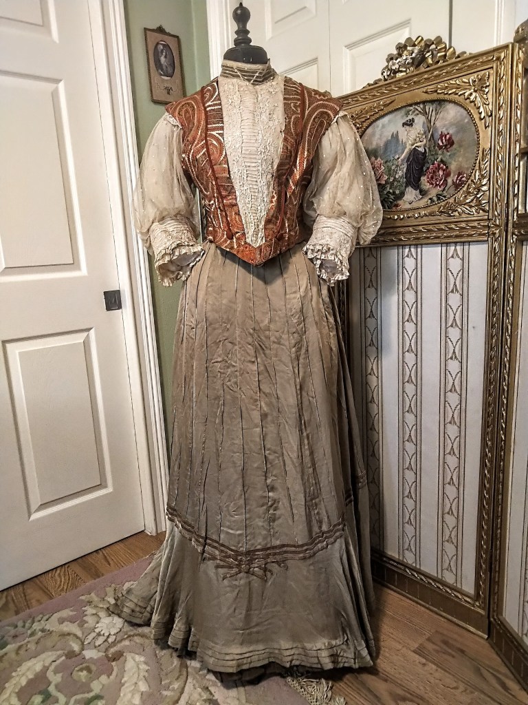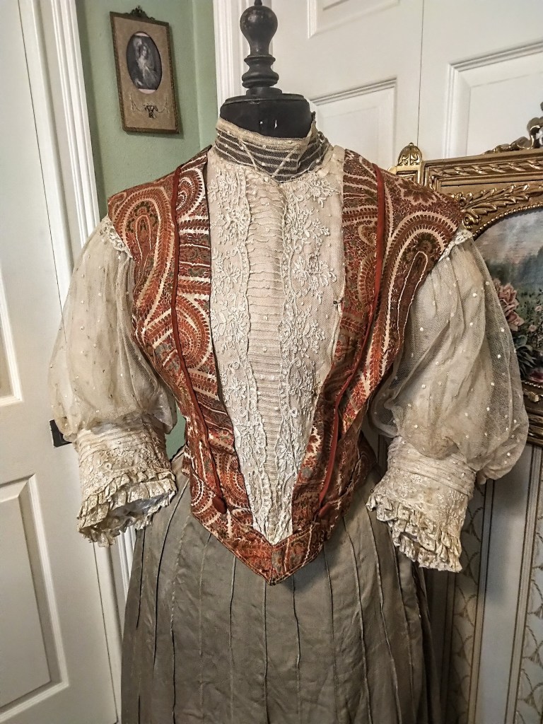 Beautiful French Silk Paisley bodice with silk and lace sleeves. One of my different bodices. Paired with one of my loden colored silk skirts. Both pieces date from early 1900s.