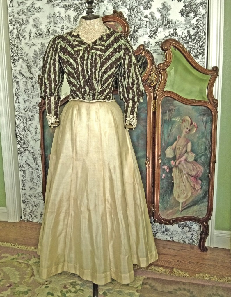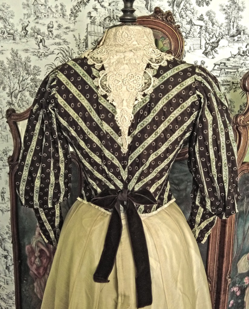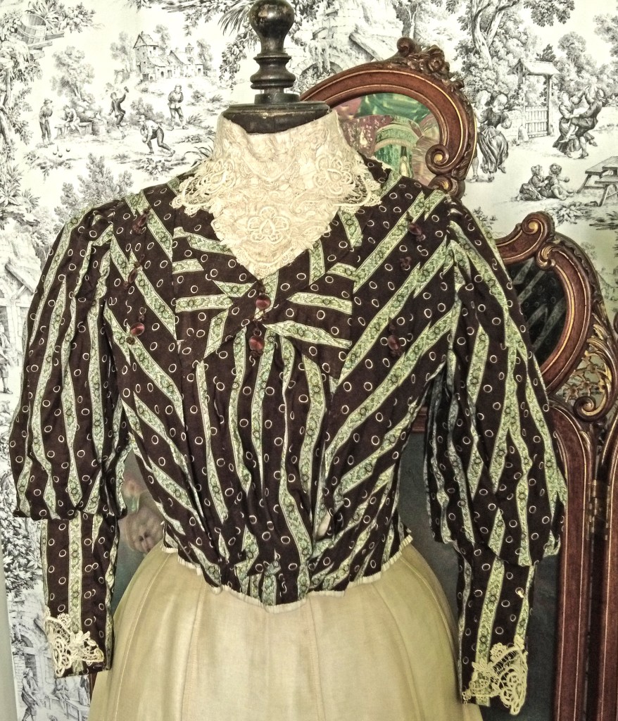 Lovely antique 1890s bodice. The fabric is a printed cotton, with alternating brown stripes with white circles, and stripes with floral design in blues and yellows. The front has elaborate gathers and bands and small tassels, with a piece fastening across with hooks going up and around the collar, with another smaller piece fastening back over this piece. The neck and stand collar are in beige silk with lace overlay. Label on the petersham reads, “James Dunlop & Son Stuart Bros Successors Drapers & Costumiers Berwick Upon Tweed.” Paired with one of my antique beige skirts.