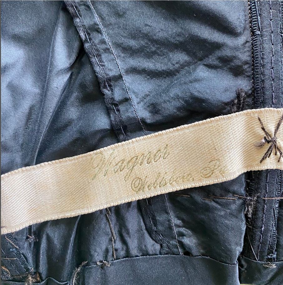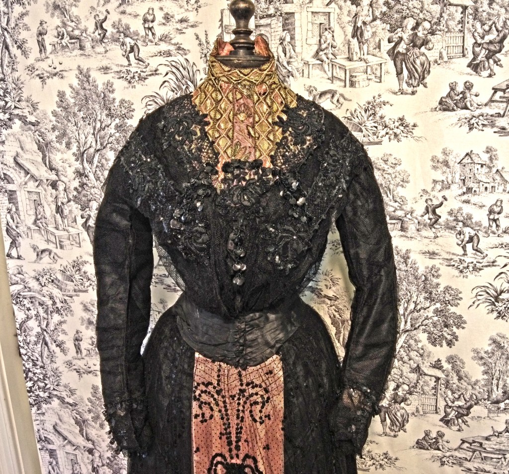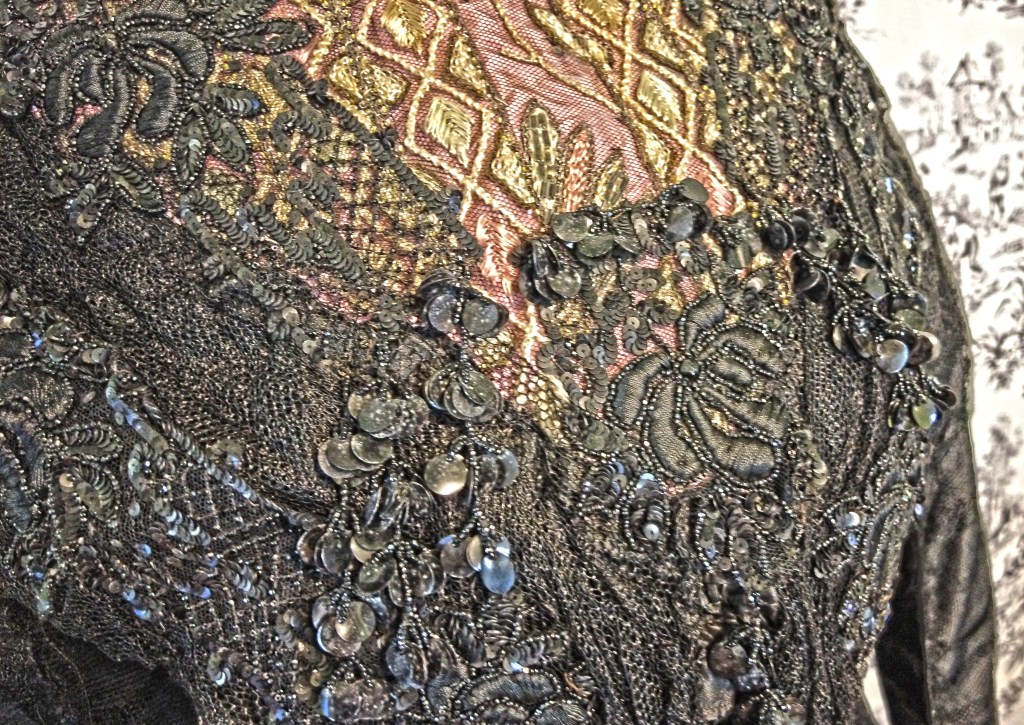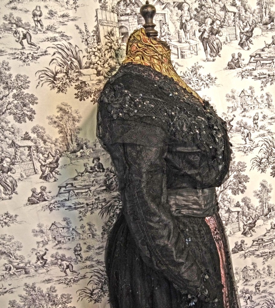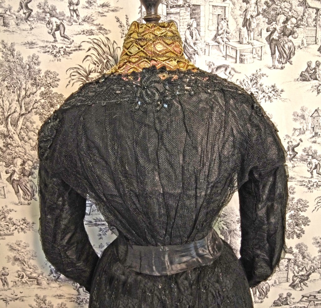 Edwardian 1900s black evening bodice. Netting lace over silk taffeta. Sequined and beaded with satin stitch flowers. Collar and neckline embroidered with a geometric leaf design, bugle beads, and an abstract flower at center with metallic thread. Shaped neck collar framed in beads and metallic thread chain-stitch. Label is Wagner of Wellsboro, Pennsylvania.Paired with a black net and sequin skirt with a pink sash under to add for color effect and to match the bodice.