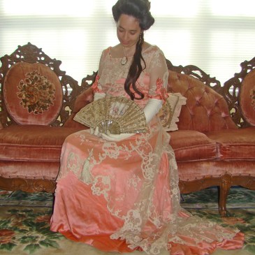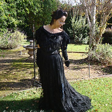 Lovely black beaded antique Edwardian silk faille bodice, with silk center and little golden metal design along the front. Paired with one of my black gabardine skirts, a short silk capelet and a Victorian green sash.