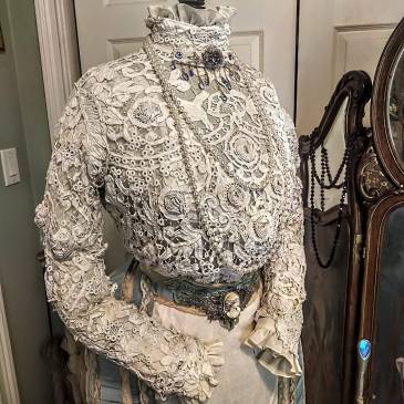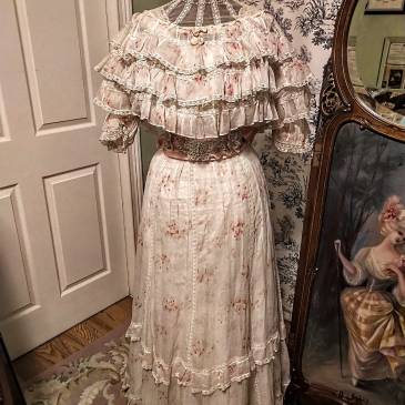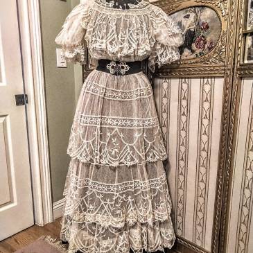 On this first week of spring, I am showcasing a circa 1903 Edwardian green silk and black lace gown by designer Fanny Gerson. Originally owned and worn by Wilhelmina Frederika Anna Elisabeth Marie (AKA princess Marie of the Netherlands) She must have been tall because the skirt is extremely long! Way too long for me, … More Fanny Gerson Gown worn by Princess Marie of the Netherlands Circa 1903