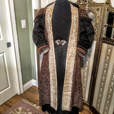 Beautiful antique Paisley Edwardian coat. I don’t have an exact year, probably early 1900s, but it is beautiful!. It is lined in heavy ivory silk satin, trimmed in lace, braided appliques, and velveteen ribbons, and has one slit in the right side seam – so that one could reach in for a misers bag or … More Antique Victorian Winter Coat