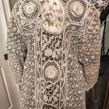 Presenting a lovely antique Victorian/Edwardian coat circa late 1890s early 1900s in ribbed silk faille with pale blush ecru hued wool. Enhanced with a double braided fringe trimmed wool pelerine style collar neckline featuring silk soutache trimmed floral cutouts with lace inserts and layered 3D wool flower centers. The center neckline has gathered sheer tissue … More Victorian/Edwardian Coat circa 1890s-1900s